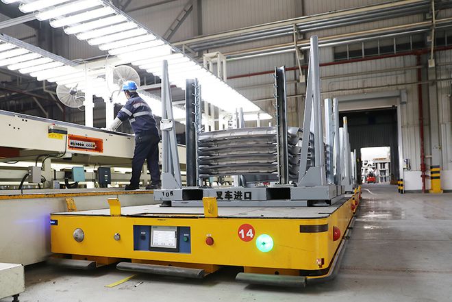 钢板完成所有冲压工序之后,都会经过人工检查,如果有问题会交到返修部门。配合检测的还有平行光检测室,检测频率是50件/次,检测合格的产品会由AGV小车运往仓库。这种小车在其他车间同样能够见到,是个智能的自动运输设备。